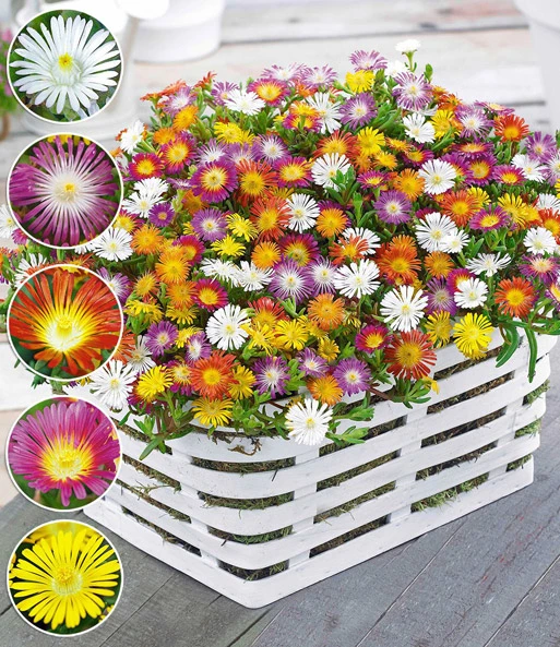 De winterharde ijsbloemen Wheels of Wonder® is een nieuwe soort van de bekende middagsbloemen, maar met duidelijk grotere bloemen! De mooie struik, geschikt voor bv. rotstuinen, bloeit bovendien met ongelooflijk veel bloemen! De kleurrijke bodembedekker kan goed tegen droge standplaatsen en heeft in principe geen verzorging nodig om er goed uit te zien! De uit Azië stammende soort ziet er bekoorlijk uit als kleurenmix of in uni kleuren geplant! De winterharde ijsbloemen Wheels of Wonder® (Delosperma congesta) zijn gegarandeerd winterhard! U ontvangt per pak één plant in de kleuren Golden Wonder, Fire Wonder, Hot Pink Wonder, Violet Wonder, White Wonder (= 5 planten).