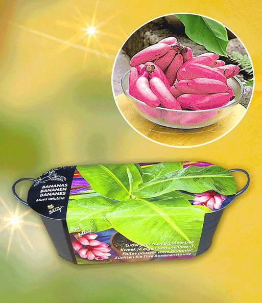 De buzzy banaan is een exotische banaan rariteit en draagt roze gekleurde bananen die uitstekend smaken. de zoete vruchten ontwikkelen zich gedurende enkele weken, zodat de roze dwergbanaan de blikken op zich gericht weet! De buzzy bananenplant wordt slechts ca. 120 cm hoog en kan op het terras en in de winter in huis worden gehouden. Het set van de buzzy banaan bevat een zinken teiltje (maten 29x11x9,5 cm), potgrond en 10 zaadjes.