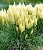 Het witte pampasgras is waarachtig koninklijk en statig! Al in het eerste standjaar laat het pampasgras zijn imposante, zilverwit schemerende pluimen boven de grijsgroene hangende bladeren zien! De vaste plant behoort tot de familie van de zoete grassen, het is winterhard en onderhoudsvriendelijk. (Cortaderia selloana)